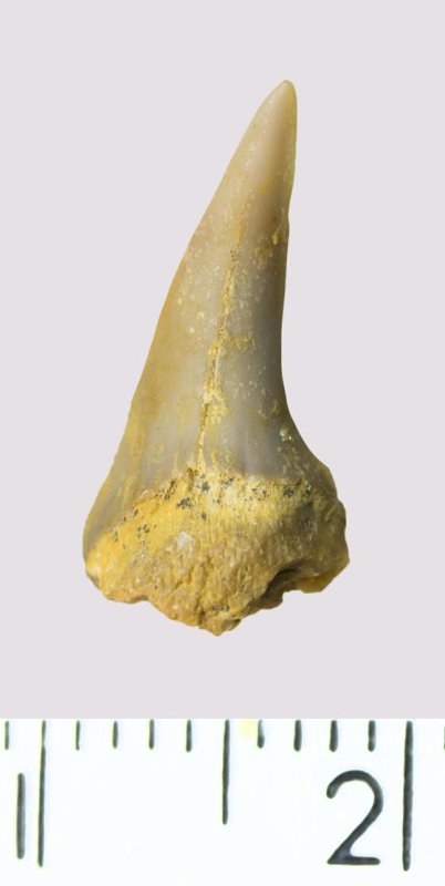 Зуб (фрагмент). Акула. Odontaspis macrorhiza (Cope) Leriche, 1902. Классификация: Хордовые Chordata, Позвоночные Vertebrata, Хрящевые рыбы Chondrichthyes, Пластиножаберные Elasmobranchii