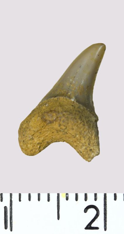 Зуб. Акула. Odontaspis macrorhiza (Cope) Leriche, 1902. Классификация: Хордовые Chordata, Позвоночные Vertebrata, Хрящевые рыбы Chondrichthyes, Пластиножаберные Elasmobranchii