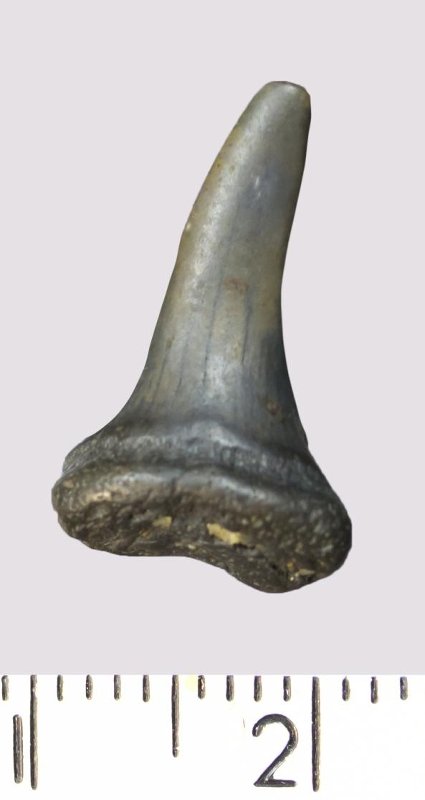 Зуб. Акула. Scapanorhynchus gigas Woodward, 1889. Классификация: Хордовые Chordata, Позвоночные Vertebrata, Хрящевые рыбы Chondrichthyes, Пластиножаберные Elasmobranchii