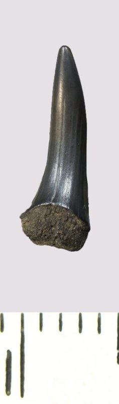 Зуб (фрагмент). Акула. Scapanorhynchus rhaphiodon Agassiz, 1843. Классификация: Хордовые Chordata, Позвоночные Vertebrata, Хрящевые рыбы Chondrichthyes, Пластиножаберные Elasmobranchii
