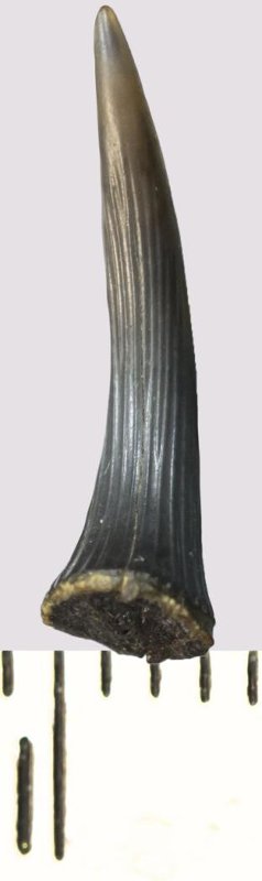 Зуб (фрагмент). Акула. Scapanorhynchus rhaphiodon Agassiz, 1843. Классификация: Хордовые Chordata, Позвоночные Vertebrata, Хрящевые рыбы Chondrichthyes, Пластиножаберные Elasmobranchii