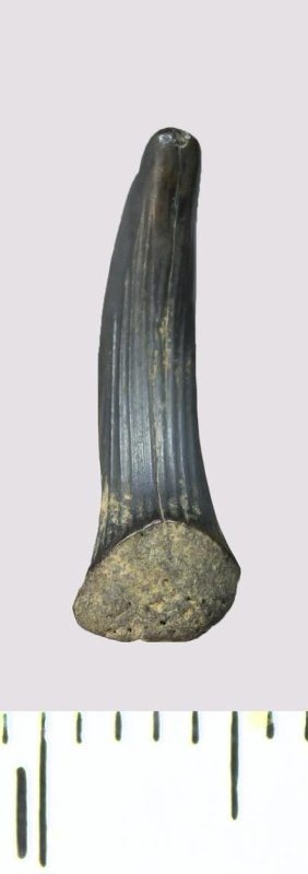 Зуб (фрагмент). Акула. Scapanorhynchus rhaphiodon Agassiz, 1843. Классификация: Хордовые Chordata, Позвоночные Vertebrata, Хрящевые рыбы Chondrichthyes, Пластиножаберные Elasmobranchii