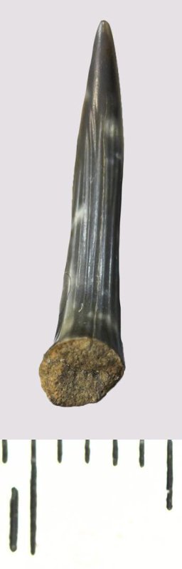 Зуб (фрагмент). Акула. Scapanorhynchus rhaphiodon Agassiz, 1843. Классификация: Хордовые Chordata, Позвоночные Vertebrata, Хрящевые рыбы Chondrichthyes, Пластиножаберные Elasmobranchii