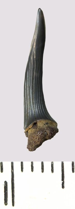 Зуб (фрагмент). Акула. Scapanorhynchus rhaphiodon Agassiz, 1843. Классификация: Хордовые Chordata, Позвоночные Vertebrata, Хрящевые рыбы Chondrichthyes, Пластиножаберные Elasmobranchii