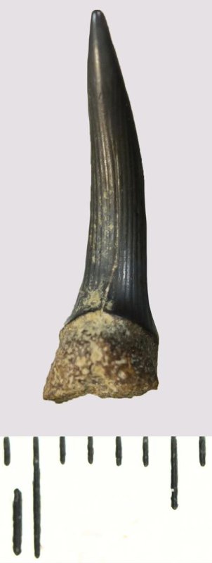 Зуб (фрагмент). Акула. Scapanorhynchus rhaphiodon Agassiz, 1843. Классификация: Хордовые Chordata, Позвоночные Vertebrata, Хрящевые рыбы Chondrichthyes, Пластиножаберные Elasmobranchii