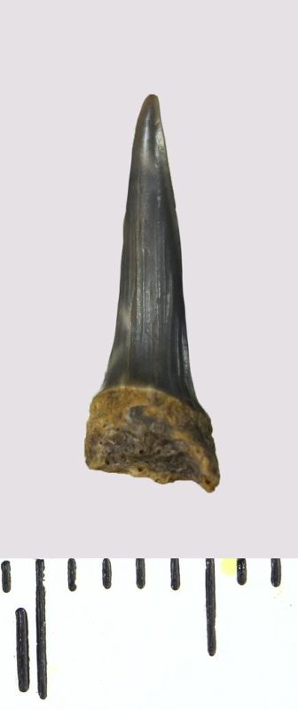 Зуб (фрагмент). Акула. Scapanorhynchus rhaphiodon Agassiz, 1843. Классификация: Хордовые Chordata, Позвоночные Vertebrata, Хрящевые рыбы Chondrichthyes, Пластиножаберные Elasmobranchii