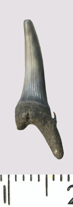 Зуб. Акула. Scapanorhynchus rhaphiodon Agassiz, 1843. Классификация: Хордовые Chordata, Позвоночные Vertebrata, Хрящевые рыбы Chondrichthyes, Пластиножаберные Elasmobranchii