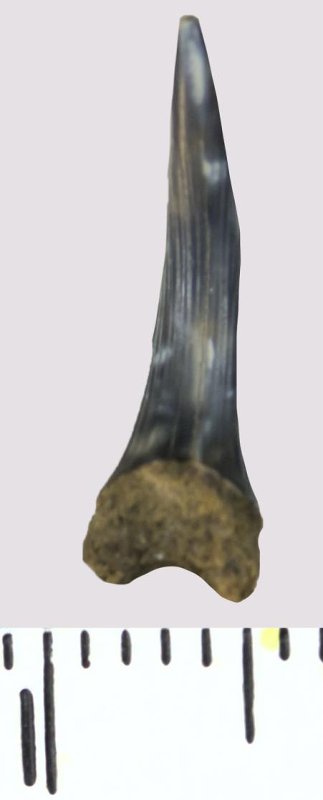 Зуб. Акула. Scapanorhynchus rhaphiodon Agassiz, 1843. Классификация: Хордовые Chordata, Позвоночные Vertebrata, Хрящевые рыбы Chondrichthyes, Пластиножаберные Elasmobranchii