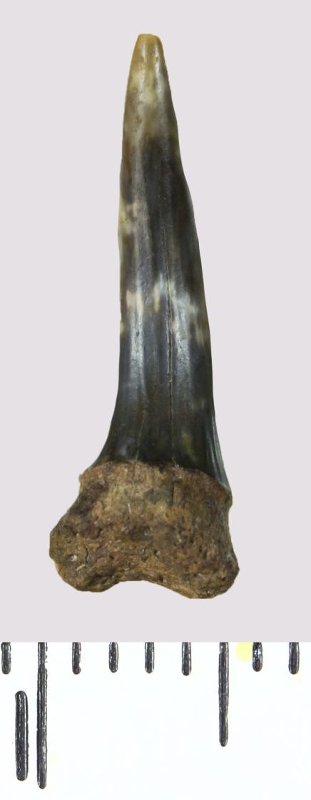 Зуб. Акула. Scapanorhynchus rhaphiodon Agassiz, 1843. Классификация: Хордовые Chordata, Позвоночные Vertebrata, Хрящевые рыбы Chondrichthyes, Пластиножаберные Elasmobranchii