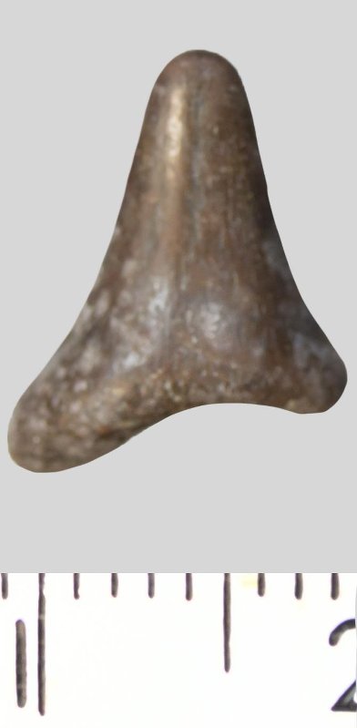 Зуб. Акула. Scapanorhynchus gigas Woodward, 1889. Классификация: Хордовые Chordata, Позвоночные Vertebrata, Хрящевые рыбы Chondrichthyes, Пластиножаберные Elasmobranchii