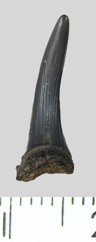 Зуб (фрагмент). Акула. Scapanorhynchus rhaphiodon Agassiz, 1843. Классификация: Хордовые Chordata, Позвоночные Vertebrata, Хрящевые рыбы Chondrichthyes, Пластиножаберные Elasmobranchii