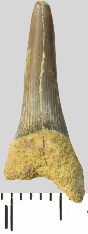Зуб. Акула. Scapanorhynchus sp. Классификация: Хордовые Chordata, Позвоночные Vertebrata, Хрящевые рыбы Chondrichthyes, Пластиножаберные Elasmobranchii