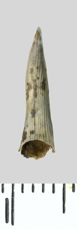 Зуб (фрагмент). Акула. Scapanorhynchus raphiodon (Agassiz, 1843). Классификация: Хордовые Chordata, Позвоночные Vertebrata, Хрящевые рыбы Chondrichthyes, Пластиножаберные Elasmobranchii