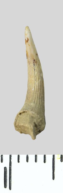 Зуб (фрагмент). Акула. Scapanorhynchus raphiodon (Agassiz, 1843). Классификация: Хордовые Chordata, Позвоночные Vertebrata, Хрящевые рыбы Chondrichthyes, Пластиножаберные Elasmobranchii