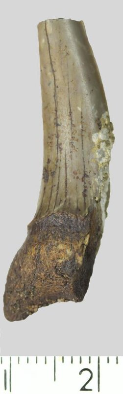 Зуб. Акула. Scapanorhynchus gigas Woodward, 1889. Классификация: Хордовые Chordata, Позвоночные Vertebrata, Хрящевые рыбы Chondrichthyes, Пластиножаберные Elasmobranchii