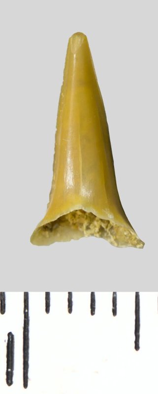 Зуб (фрагмент). Акула. Odontaspis venusta (Leriche, 1929). Классификация: Хордовые Chordata, Позвоночные Vertebrata, Хрящевые рыбы Chondrichthyes, Пластиножаберные Elasmobranchii