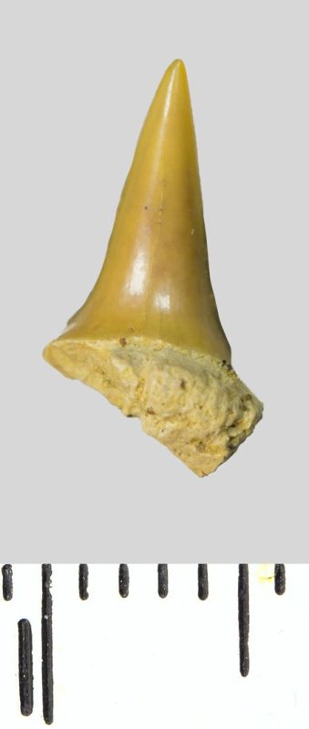 Зуб (фрагмент). Акула. Odontaspis venusta (Leriche, 1929). Классификация: Хордовые Chordata, Позвоночные Vertebrata, Хрящевые рыбы Chondrichthyes, Пластиножаберные Elasmobranchii