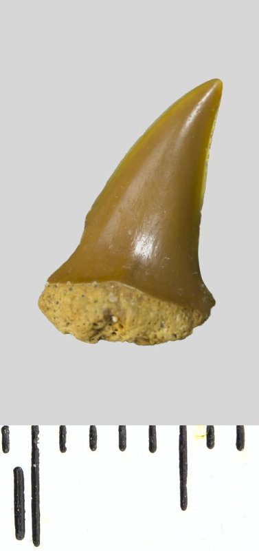 Зуб (фрагмент). Акула. Odontaspis venusta (Leriche, 1929). Классификация: Хордовые Chordata, Позвоночные Vertebrata, Хрящевые рыбы Chondrichthyes, Пластиножаберные Elasmobranchii
