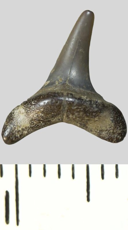 Зуб. Акула. Eostriatolamia subulata (Agassiz, 1843). Классификация: Хордовые Chordata, Позвоночные Vertebrata, Хрящевые рыбы Chondrichthyes, Пластиножаберные Elasmobranchii