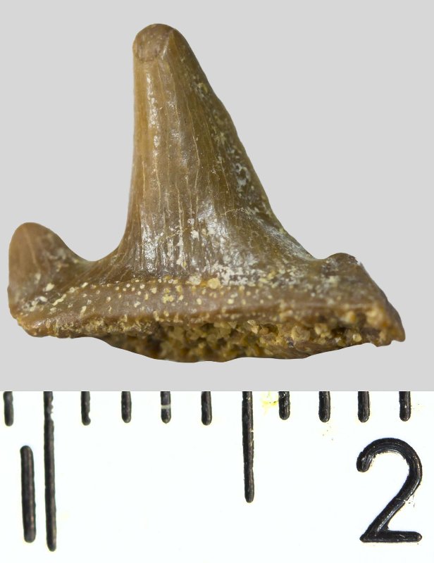 Зуб (фрагмент). Акула. Hybodus sp. Классификация: Хордовые Chordata, Позвоночные Vertebrata, Хрящевые рыбы Chondrichthyes, Пластиножаберные Elasmobranchii