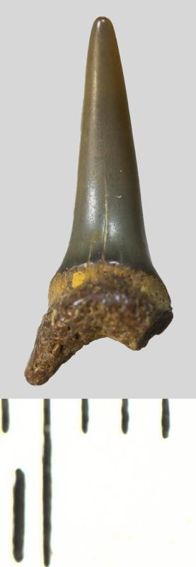 Зуб. Акула. Scapanorhynchus eorhaphiodon Glueckman, 1980. Классификация: Хордовые Chordata, Позвоночные Vertebrata, Хрящевые рыбы Chondrichthyes, Пластиножаберные Elasmobranchii