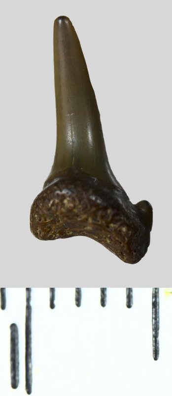Зуб. Акула. Scapanorhynchus eorhaphiodon Glueckman, 1980. Классификация: Хордовые Chordata, Позвоночные Vertebrata, Хрящевые рыбы Chondrichthyes, Пластиножаберные Elasmobranchii