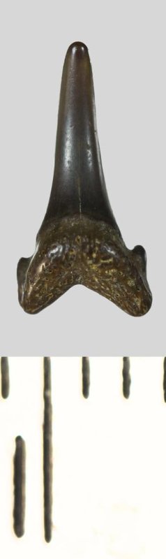 Зуб. Акула. Scapanorhynchus eorhaphiodon Glueckman, 1980. Классификация: Хордовые Chordata, Позвоночные Vertebrata, Хрящевые рыбы Chondrichthyes, Пластиножаберные Elasmobranchii