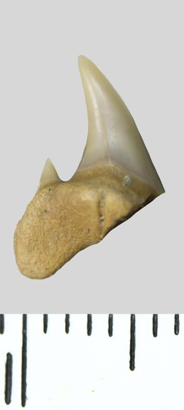 Зуб. Акула. Pseudoisurus rochebruni (Sow.). Классификация: Хордовые Chordata, Позвоночные Vertebrata, Хрящевые рыбы Chondrichthyes, Пластиножаберные Elasmobranchii