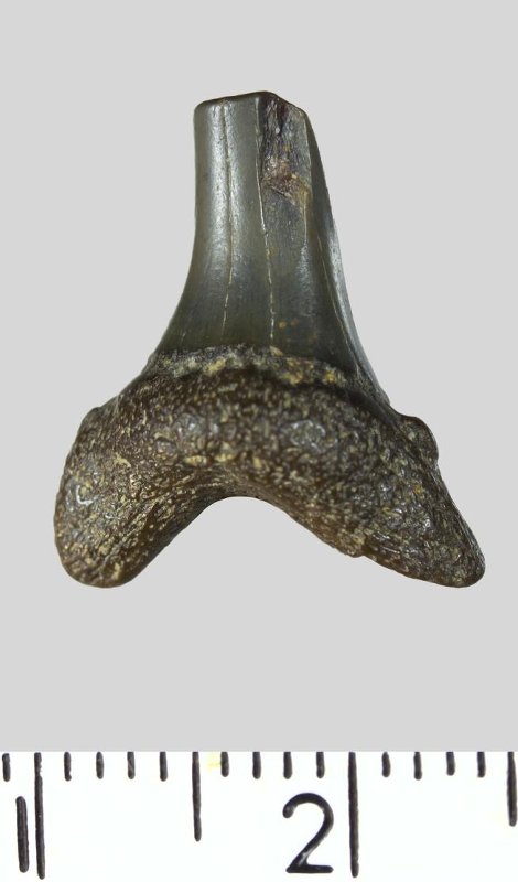 Зуб. Акула. Scapanorhynchus gigas Woodward, 1889. Классификация: Хордовые Chordata, Позвоночные Vertebrata, Хрящевые рыбы Chondrichthyes, Пластиножаберные Elasmobranchii