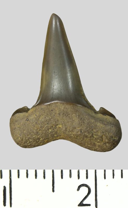 Зуб. Акула. Scapanorhynchus gigas Woodward, 1889. Классификация: Хордовые Chordata, Позвоночные Vertebrata, Хрящевые рыбы Chondrichthyes, Пластиножаберные Elasmobranchii