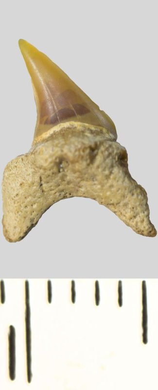 Зуб. Акула. Pseudoisurus rochebruni (Sow.). Классификация: Хордовые Chordata, Позвоночные Vertebrata, Хрящевые рыбы Chondrichthyes, Пластиножаберные Elasmobranchii