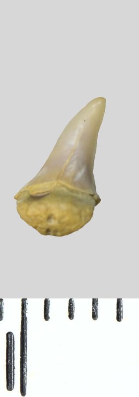 Зуб (фрагмент). Акула. Lamniformes gen. et sp. indet. Классификация: Хордовые Chordata, Позвоночные Vertebrata, Хрящевые рыбы Chondrichthyes, Пластиножаберные Elasmobranchii