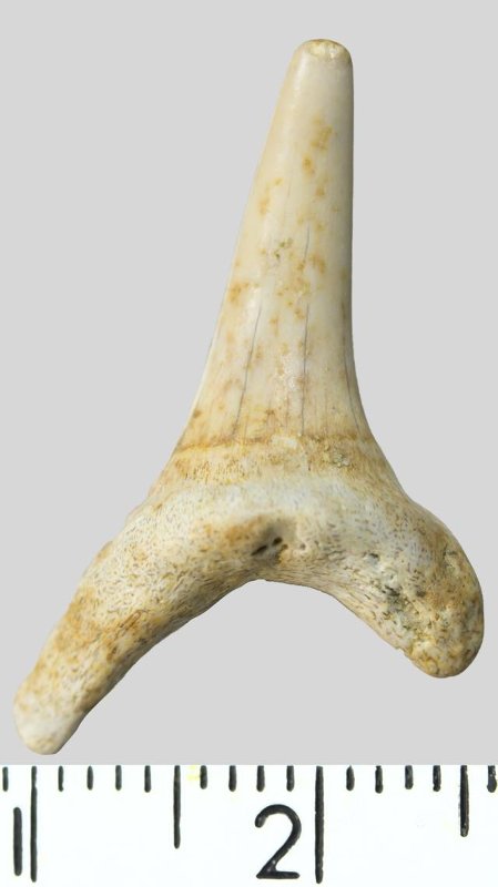 Зуб. Акула. Scapanorhynchus gigas Woodward, 1889. Классификация: Хордовые Chordata, Позвоночные Vertebrata, Хрящевые рыбы Chondrichthyes, Пластиножаберные Elasmobranchii