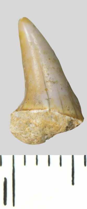 Зуб (фрагмент). Акула. Lamniformes gen. et sp. indet. Классификация: Хордовые Chordata, Позвоночные Vertebrata, Хрящевые рыбы Chondrichthyes, Пластиножаберные Elasmobranchii