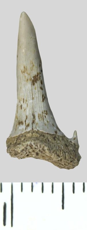 Зуб. Акула. Odontaspis whitei Arambourg, 1952. Классификация: Хордовые Chordata, Позвоночные Vertebrata, Хрящевые рыбы Chondrichthyes, Пластиножаберные Elasmobranchii