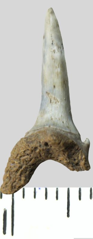 Зуб. Акула. Odontaspis whitei Arambourg, 1952. Классификация: Хордовые Chordata, Позвоночные Vertebrata, Хрящевые рыбы Chondrichthyes, Пластиножаберные Elasmobranchii
