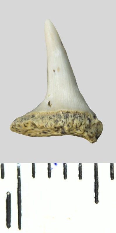 Зуб. Акула. Odontaspis whitei Arambourg, 1952. Классификация: Хордовые Chordata, Позвоночные Vertebrata, Хрящевые рыбы Chondrichthyes, Пластиножаберные Elasmobranchii