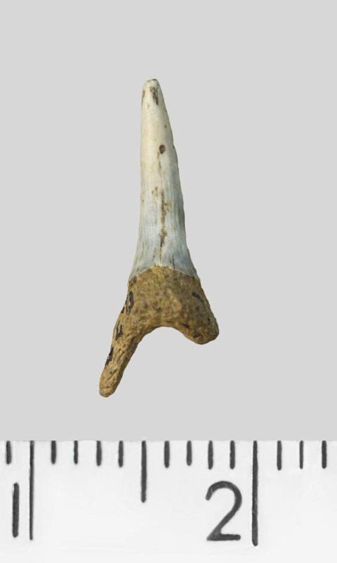 Зуб. Акула. Odontaspis whitei Arambourg, 1952. Классификация: Хордовые Chordata, Позвоночные Vertebrata, Хрящевые рыбы Chondrichthyes, Пластиножаберные Elasmobranchii