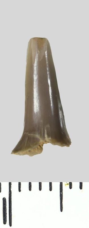 Зуб (фрагмент). Акула. Odontaspis ex. gr. whitei Arambourg, 1952. Классификация: Хордовые Chordata, Позвоночные Vertebrata, Хрящевые рыбы Chondrichthyes, Пластиножаберные Elasmobranchii