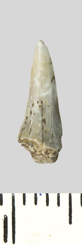 Зуб (фрагмент). Акула. Odontaspis whitei Arambourg, 1952. Классификация: Хордовые Chordata, Позвоночные Vertebrata, Хрящевые рыбы Chondrichthyes, Пластиножаберные Elasmobranchii
