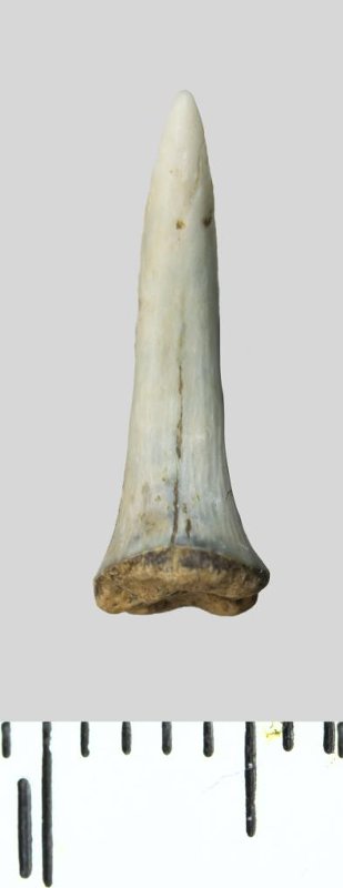 Зуб (фрагмент). Акула. Odontaspis whitei Arambourg, 1952. Классификация: Хордовые Chordata, Позвоночные Vertebrata, Хрящевые рыбы Chondrichthyes, Пластиножаберные Elasmobranchii