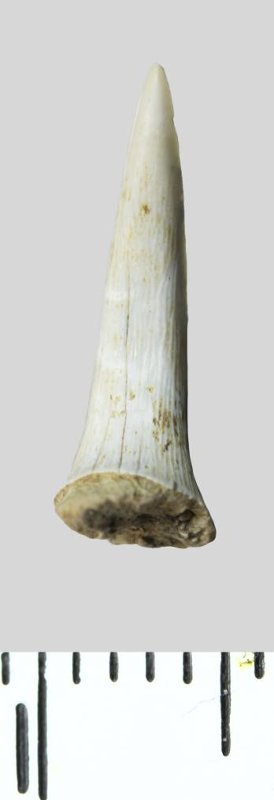 Зуб (фрагмент). Акула. Odontaspis whitei Arambourg, 1952. Классификация: Хордовые Chordata, Позвоночные Vertebrata, Хрящевые рыбы Chondrichthyes, Пластиножаберные Elasmobranchii