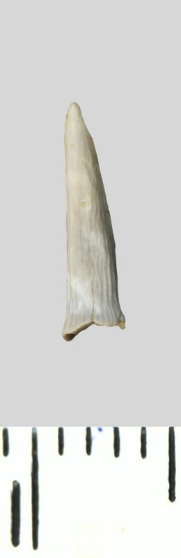 Зуб (фрагмент). Акула. Odontaspis whitei Arambourg, 1952. Классификация: Хордовые Chordata, Позвоночные Vertebrata, Хрящевые рыбы Chondrichthyes, Пластиножаберные Elasmobranchii