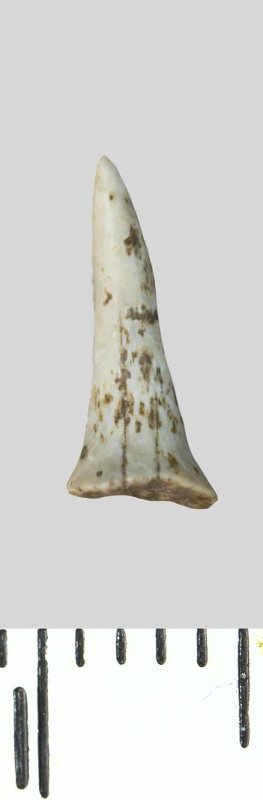 Зуб (фрагмент). Акула. Odontaspis whitei Arambourg, 1952. Классификация: Хордовые Chordata, Позвоночные Vertebrata, Хрящевые рыбы Chondrichthyes, Пластиножаберные Elasmobranchii