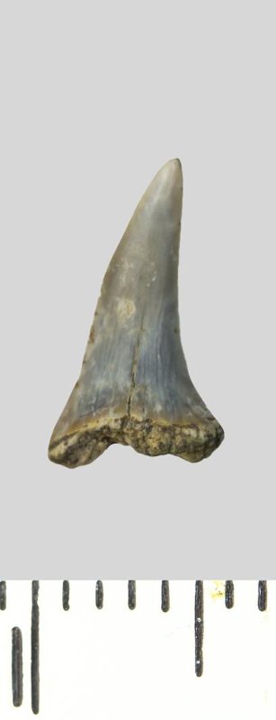 Зуб (фрагмент). Акула. Odontaspis whitei Arambourg, 1952. Классификация: Хордовые Chordata, Позвоночные Vertebrata, Хрящевые рыбы Chondrichthyes, Пластиножаберные Elasmobranchii