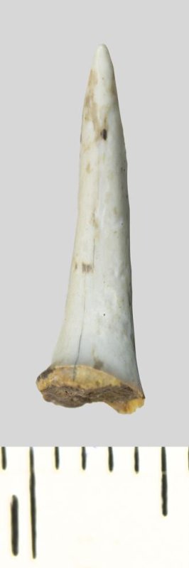 Зуб (фрагмент). Акула. Odontaspis whitei Arambourg, 1952. Классификация: Хордовые Chordata, Позвоночные Vertebrata, Хрящевые рыбы Chondrichthyes, Пластиножаберные Elasmobranchii