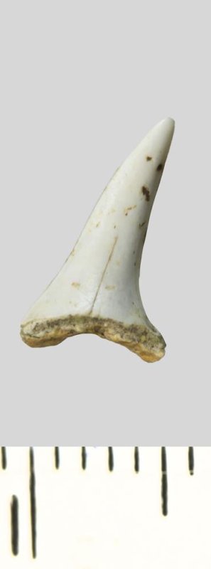 Зуб (фрагмент). Акула. Odontaspis whitei Arambourg, 1952. Классификация: Хордовые Chordata, Позвоночные Vertebrata, Хрящевые рыбы Chondrichthyes, Пластиножаберные Elasmobranchii