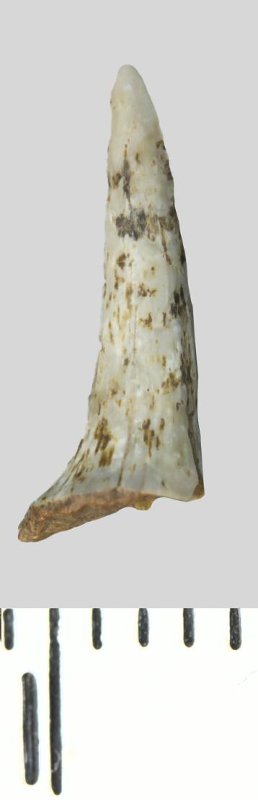 Зуб (фрагмент). Акула. Odontaspis whitei Arambourg, 1952. Классификация: Хордовые Chordata, Позвоночные Vertebrata, Хрящевые рыбы Chondrichthyes, Пластиножаберные Elasmobranchii