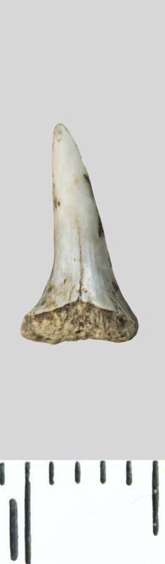 Зуб (фрагмент). Акула. Odontaspis whitei Arambourg, 1952. Классификация: Хордовые Chordata, Позвоночные Vertebrata, Хрящевые рыбы Chondrichthyes, Пластиножаберные Elasmobranchii