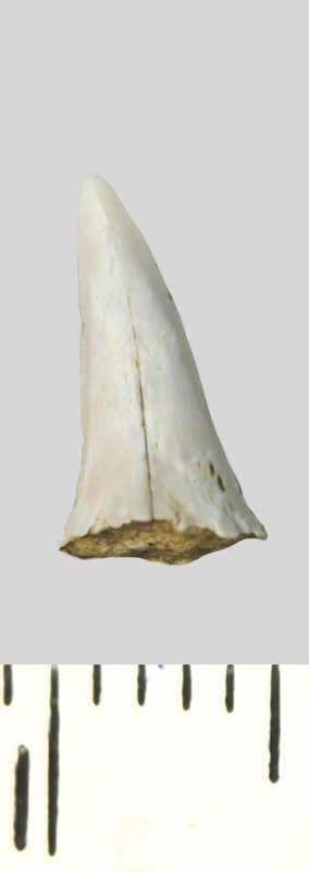 Зуб (фрагмент). Акула. Odontaspis whitei Arambourg, 1952. Классификация: Хордовые Chordata, Позвоночные Vertebrata, Хрящевые рыбы Chondrichthyes, Пластиножаберные Elasmobranchii